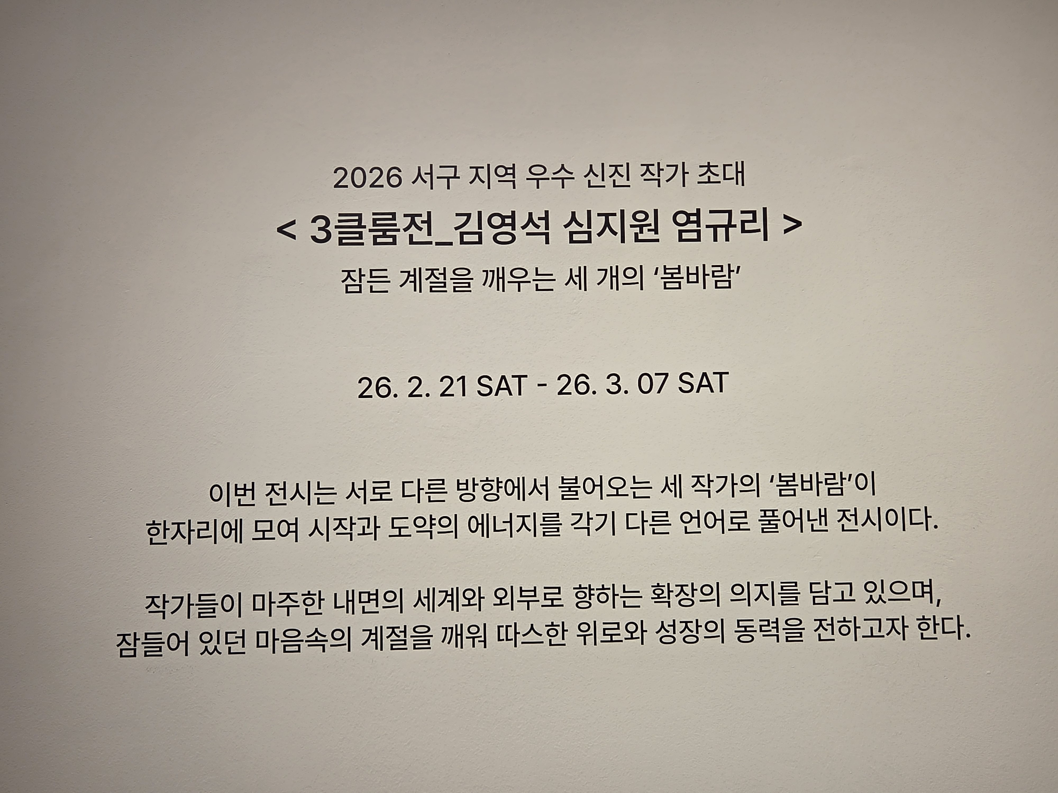 이번 전시는 서로 다른 방향에서 불어오는 세 작가의 ‘봄바람’ 이 한자리에 모여, ‘시작’ 과 ‘도약’ 의 에너지를 각기 다른 예술 언어로 풀어낸 전시회로 청년 작가들이 마주한 내면의 세계를 섬세하게 들여다보는 동시에, 외부로 향하는 확장의 의지를 작품 속에 담아 낸다고 했다.
